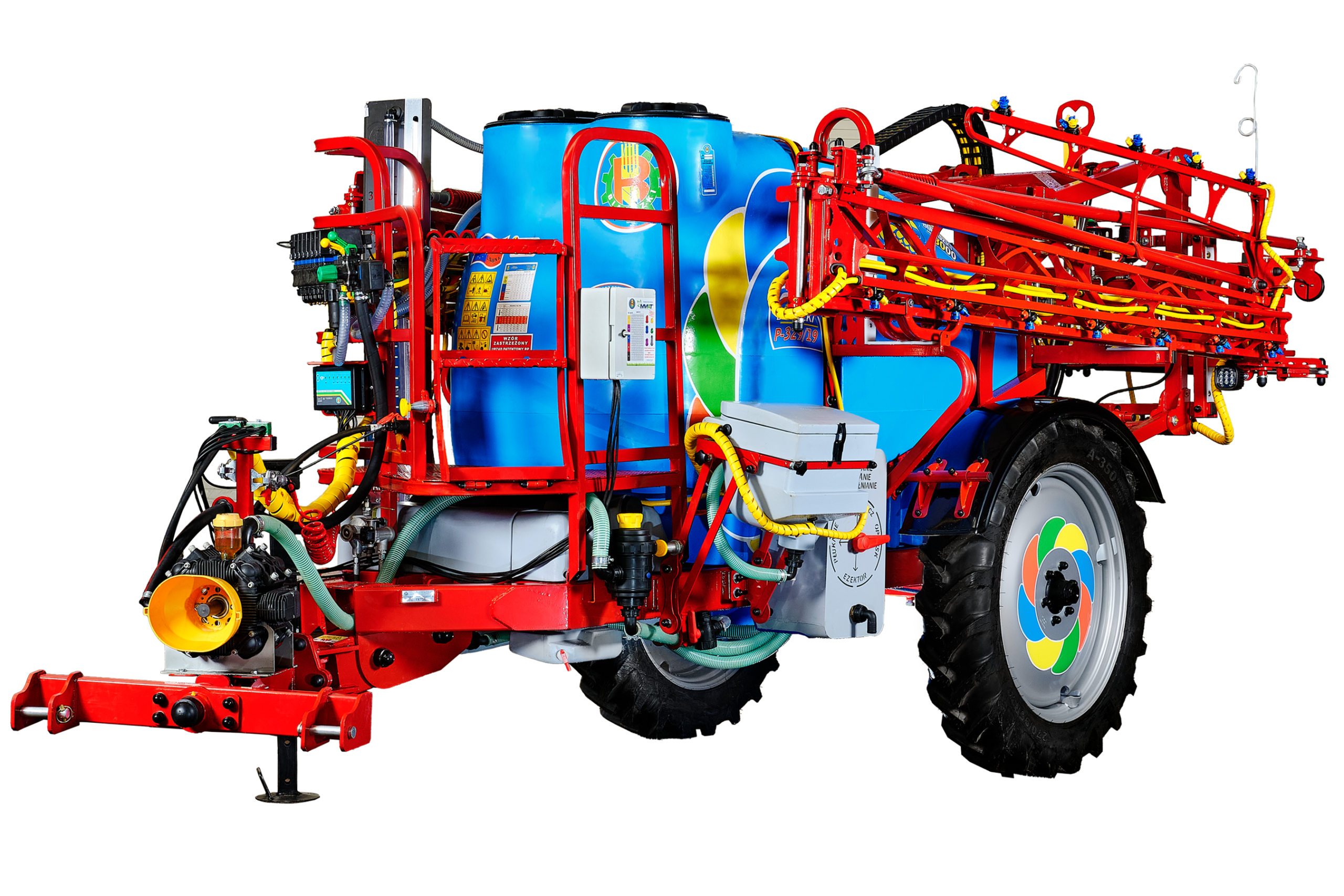 Zaczep obrotowo-skrętny kopiujący ślad ciągnika na uwrociach; Mieszadło hydrauliczne eżektorowe zapewnia utrzymanie jednakowego stężenia cieczy roboczej